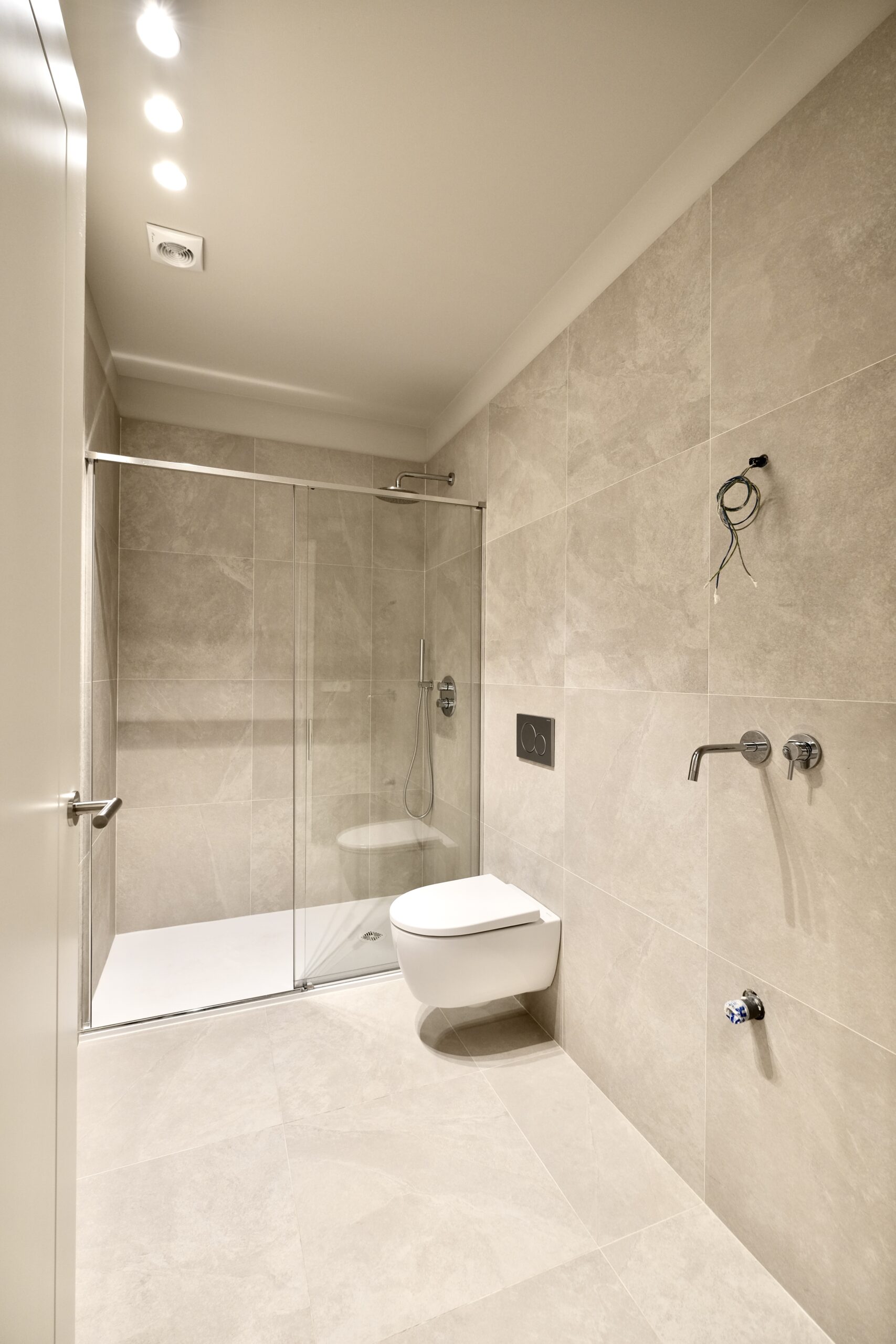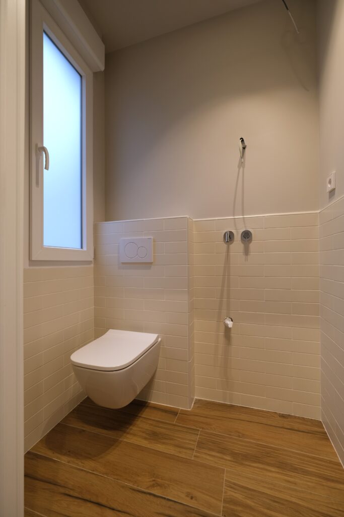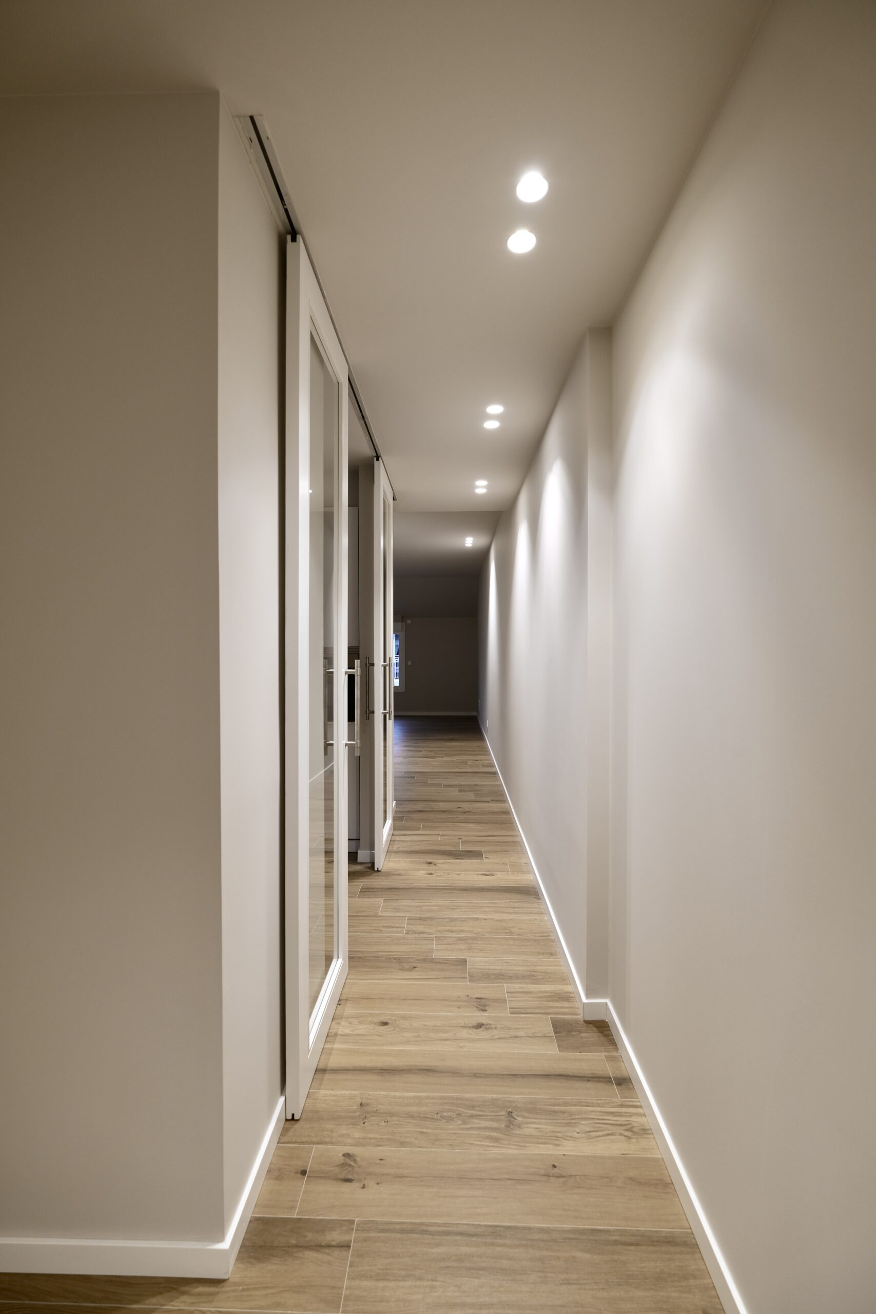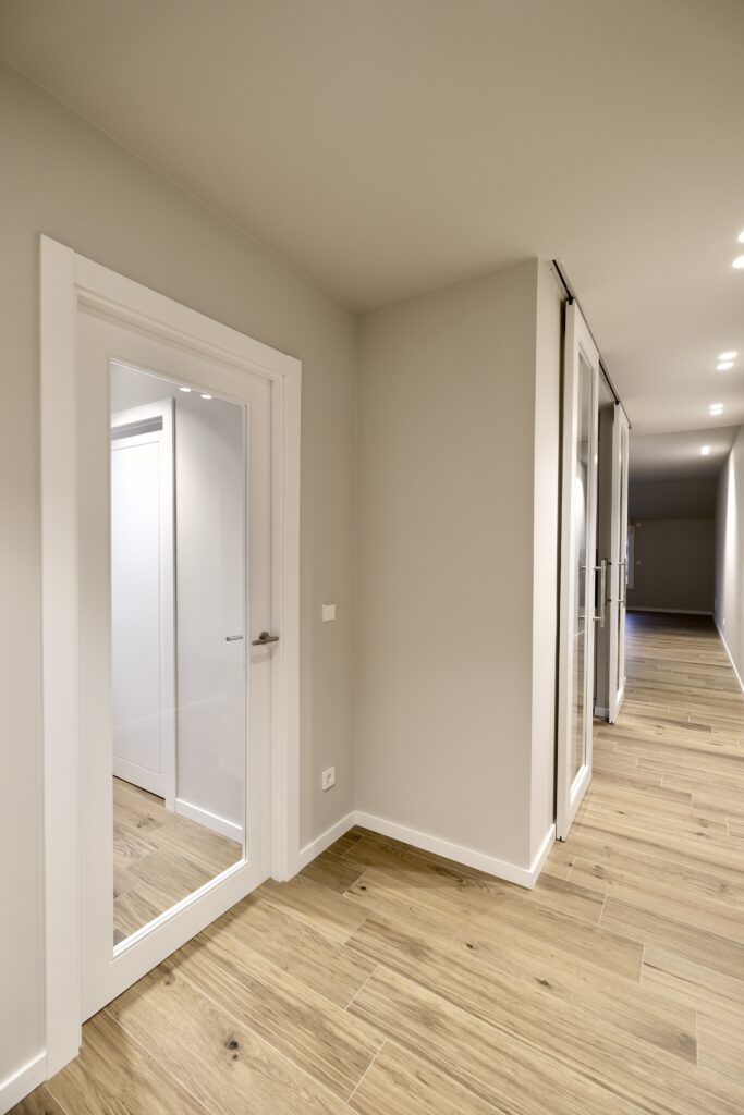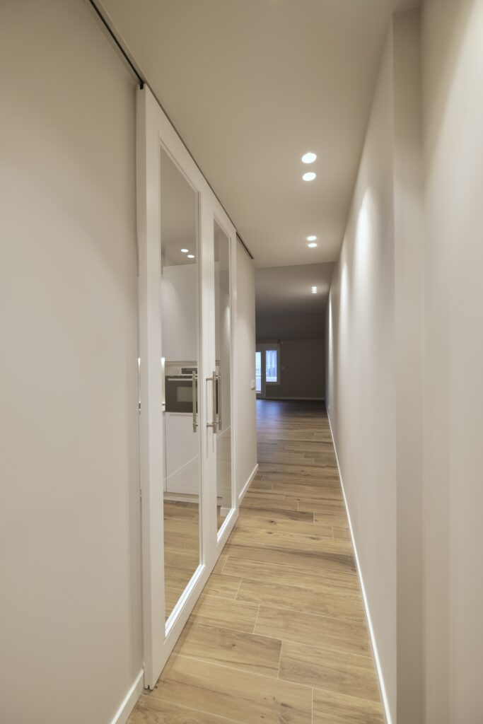 Para mejorar la privacidad sin sacrificar estilo, instalamos dos puertas correderas acristaladas que delimitan la cocina del resto del hogar. Esta decisión permite mantener una conexión visual, pero con la posibilidad de independizar el espacio cuando se desea. Además, seleccionamos cerámica de la firma MARAZZI para el suelo, que garantiza resistencia y un acabado moderno. En los baños, optamos por cerámica Durstone, que combina durabilidad con una estética contemporánea y refinada.