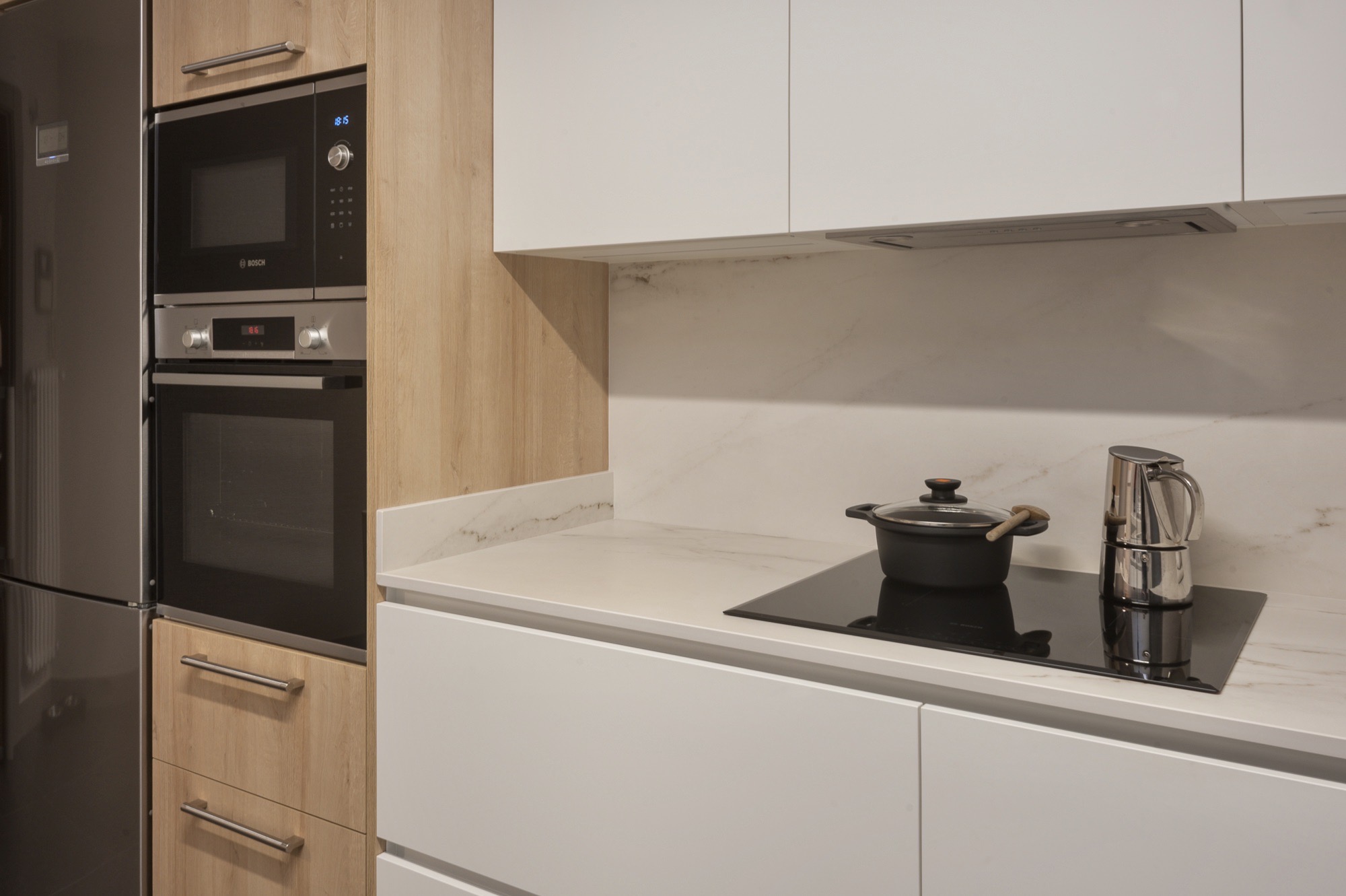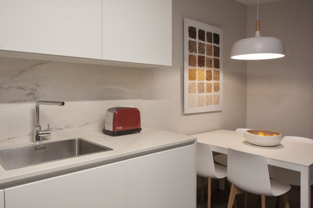 La última habitación a la que accedemos es la cocina de la firmaDOCA. Un diseño muy práctico donde destaca la fluidez de los espacios. En la cocina también hemos creado una pequeña zona de comedor que es perfecta para el día a día.