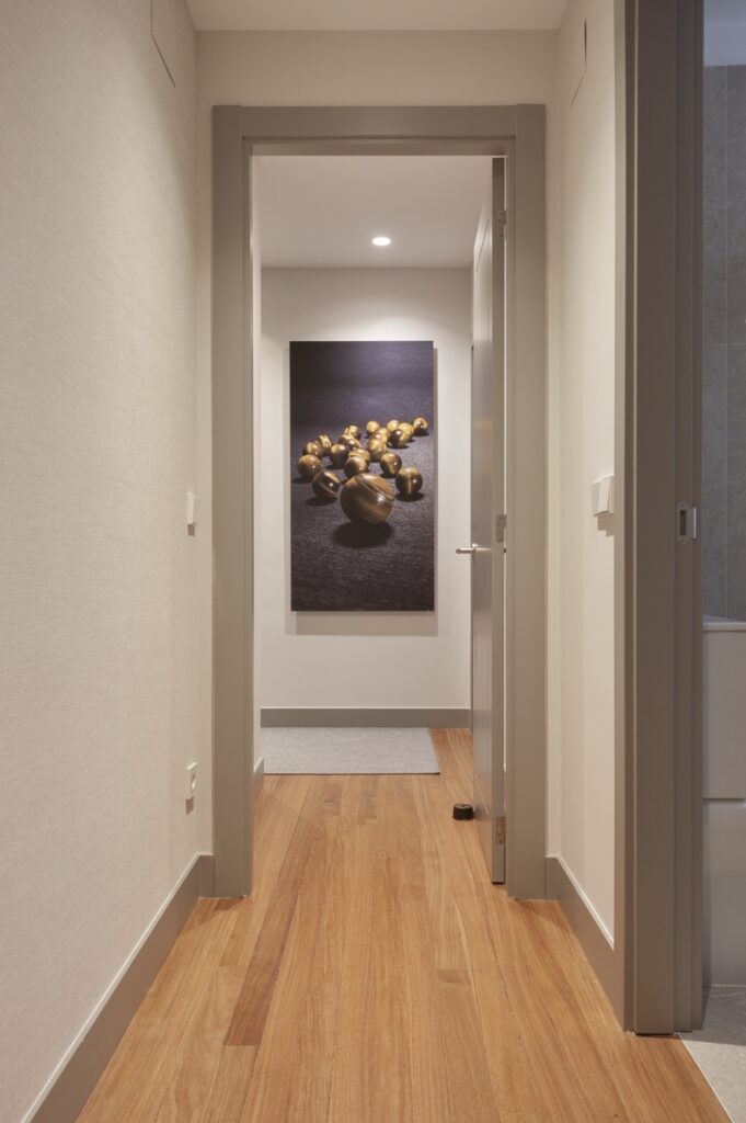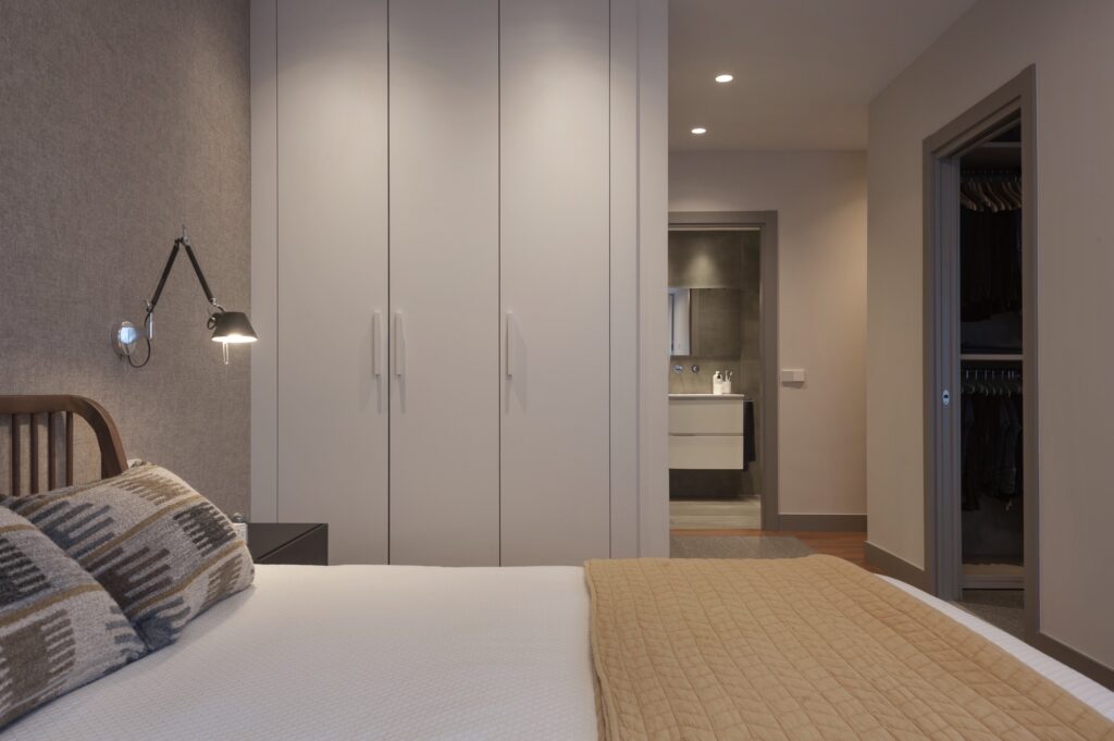 A continuación accedemos a un vestidor con acceso directo desde la habitación principal. En ambas habitaciones hemos combinado diferentes texturas y tonalidades con el objetivo de crear contrastes.