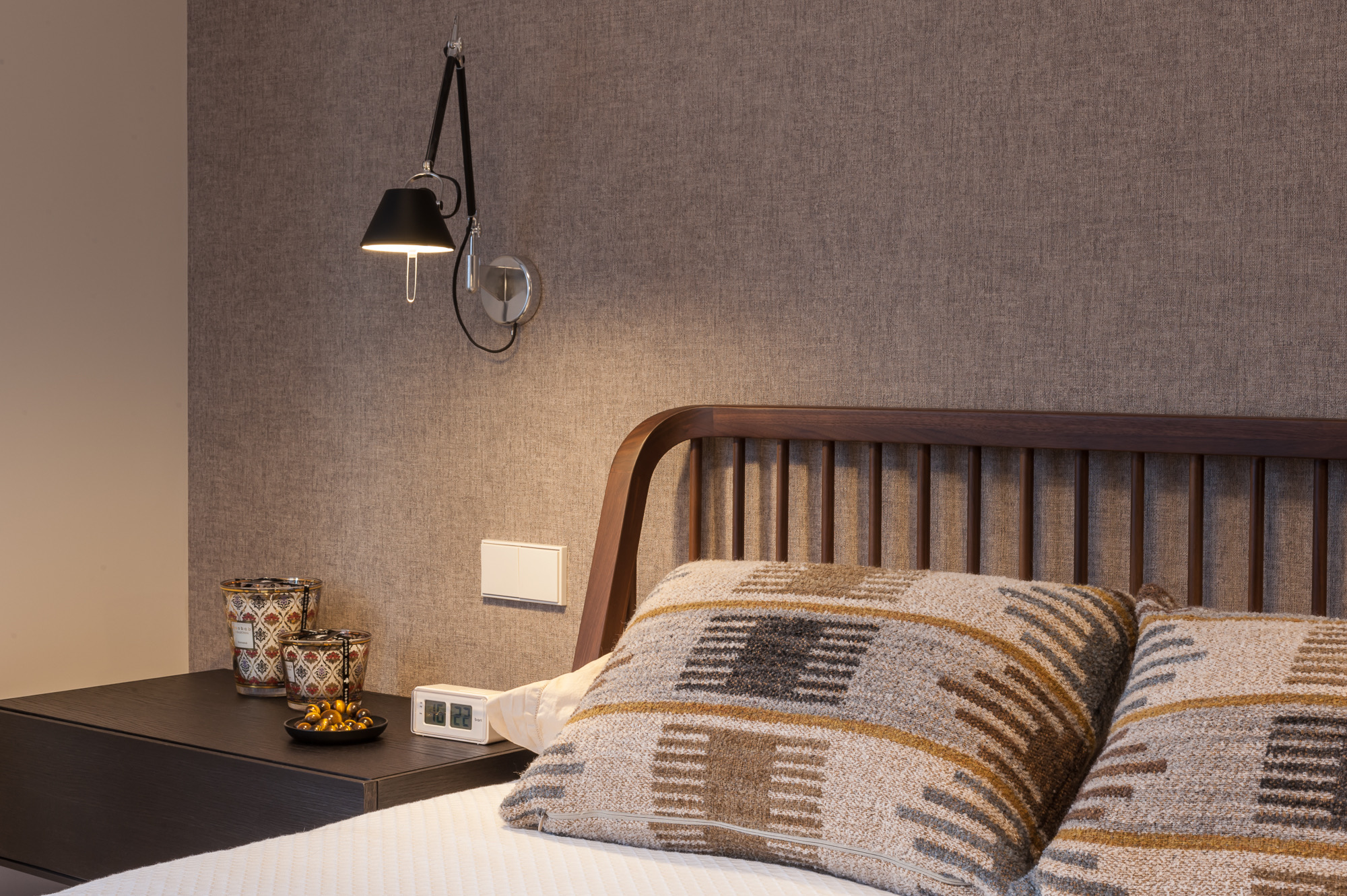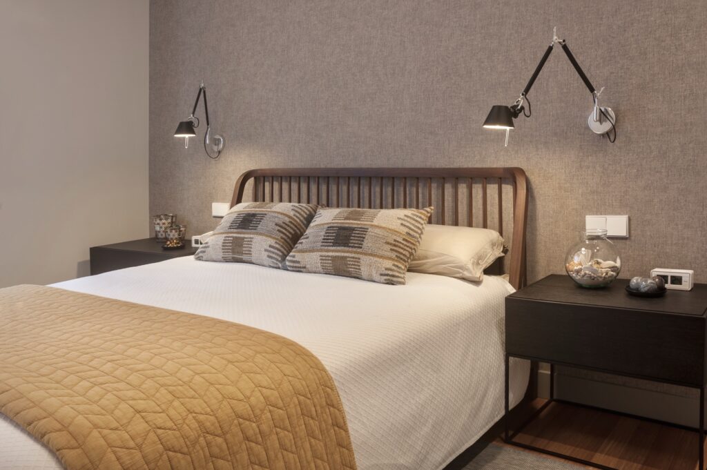 En cuanto al dormitorio principal, tal y como nos pidieron los propietarios, se decoró con un estilo sobrio. Destaca sobre todo la calidez que aporta la madera de nogal de la estructura de cama.
