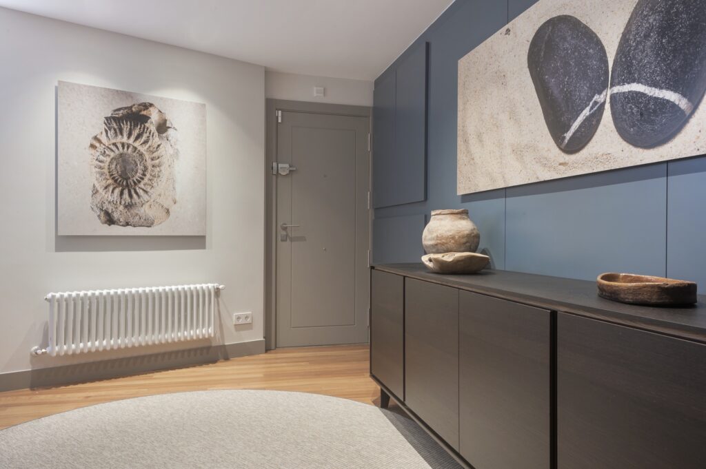 En primer lugar encontramos el recibidor, que está cubierto en parte por un gran empanelado. El objetivo de este diseño era conseguir una entrada acogedora y, además, ocultar los registros de la pared. De esta forma, hemos logrado un acceso cómodo y práctico a los registros, pero sin perder de vista el criterio estético.