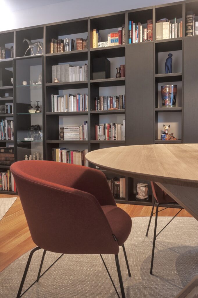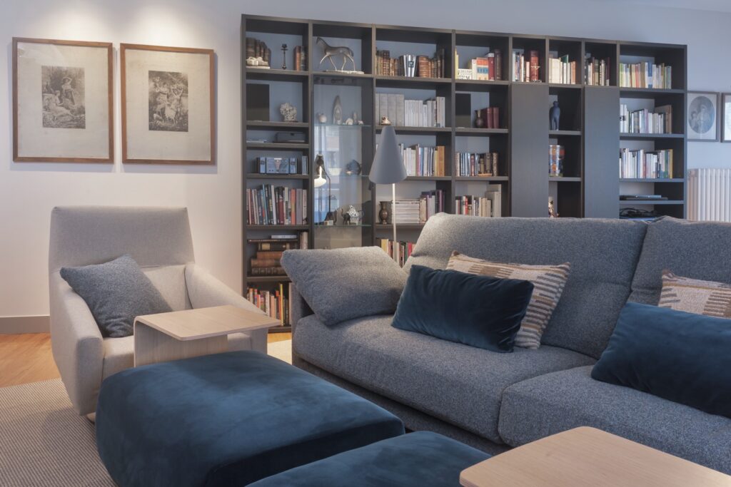 Por último, como nexo de unión en ambas zonas hemos colocado una librería con vitrina acristalada de la firma LEMA. De esta forma los propietarios pueden almacenar, tanto sus numerosos libros como sus artículos decorativos con gran valor sentimental.
