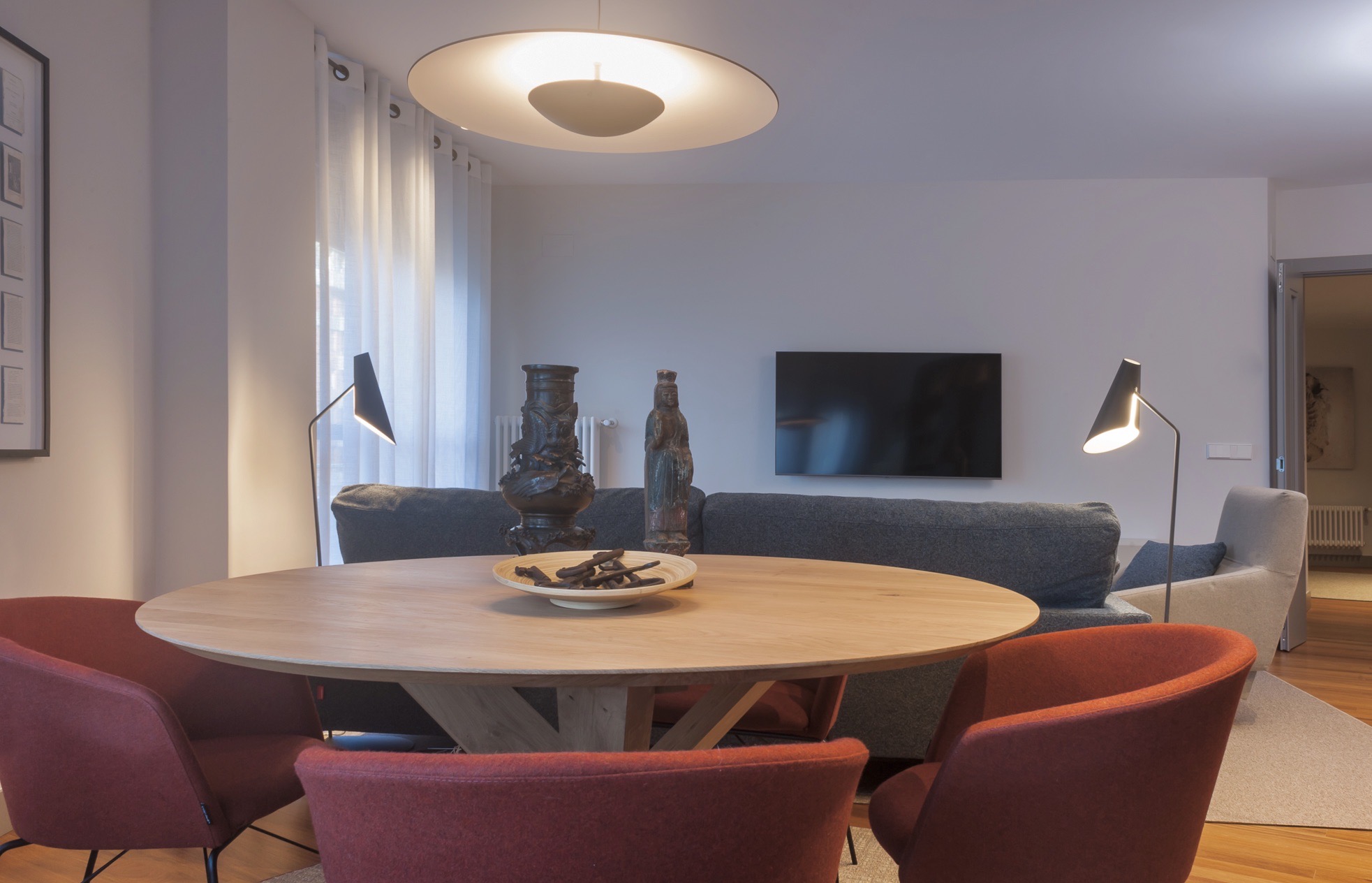 Otro ambiente que encontramos en este espacio es el comedor que está compuesto por una gran mesa redonda de roble macizo, que cumple dos funciones: por una parte sirve de mesa de comedor y, por otra, de mesa de trabajo. De esta forma conseguimos un espacio agradable y multifuncional. Y además muy bien iluminado gracias a la luz natural que entra por un gran ventanal.