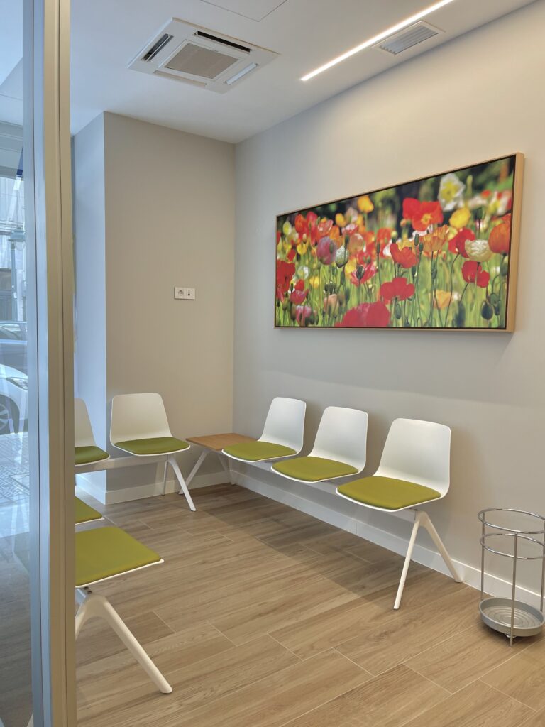 Incorporamos madera en tonos claros para aportar calidez y reforzar la sensación de acogida. Además, seleccionamos cuidadosamente imágenes y composiciones artísticas que transmiten paz, logrando espacios visualmente armónicos que favorecen la relajación del paciente.