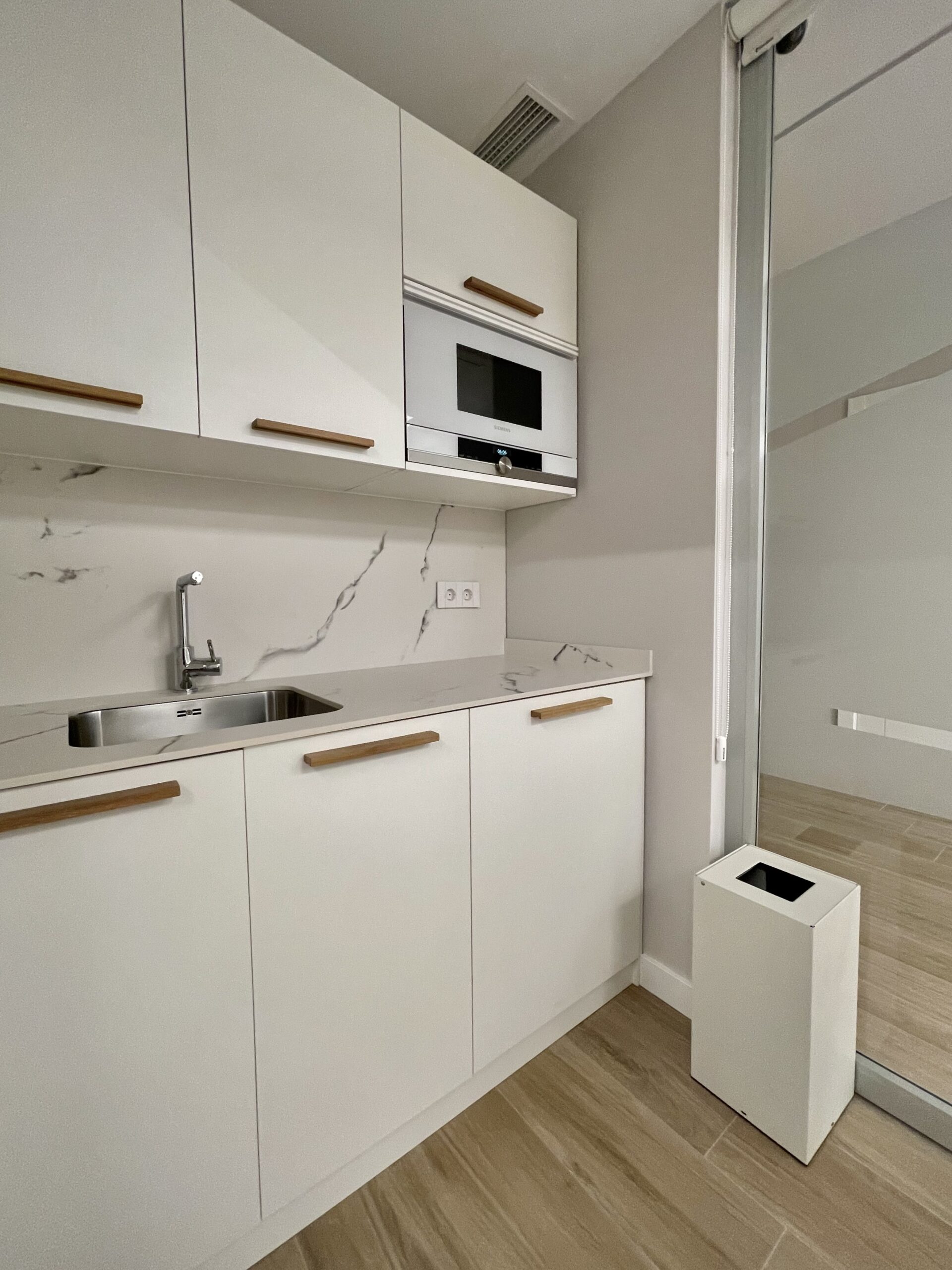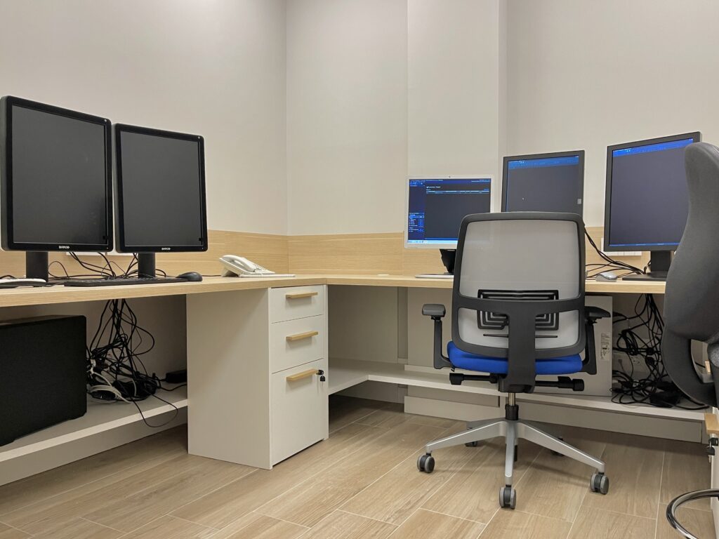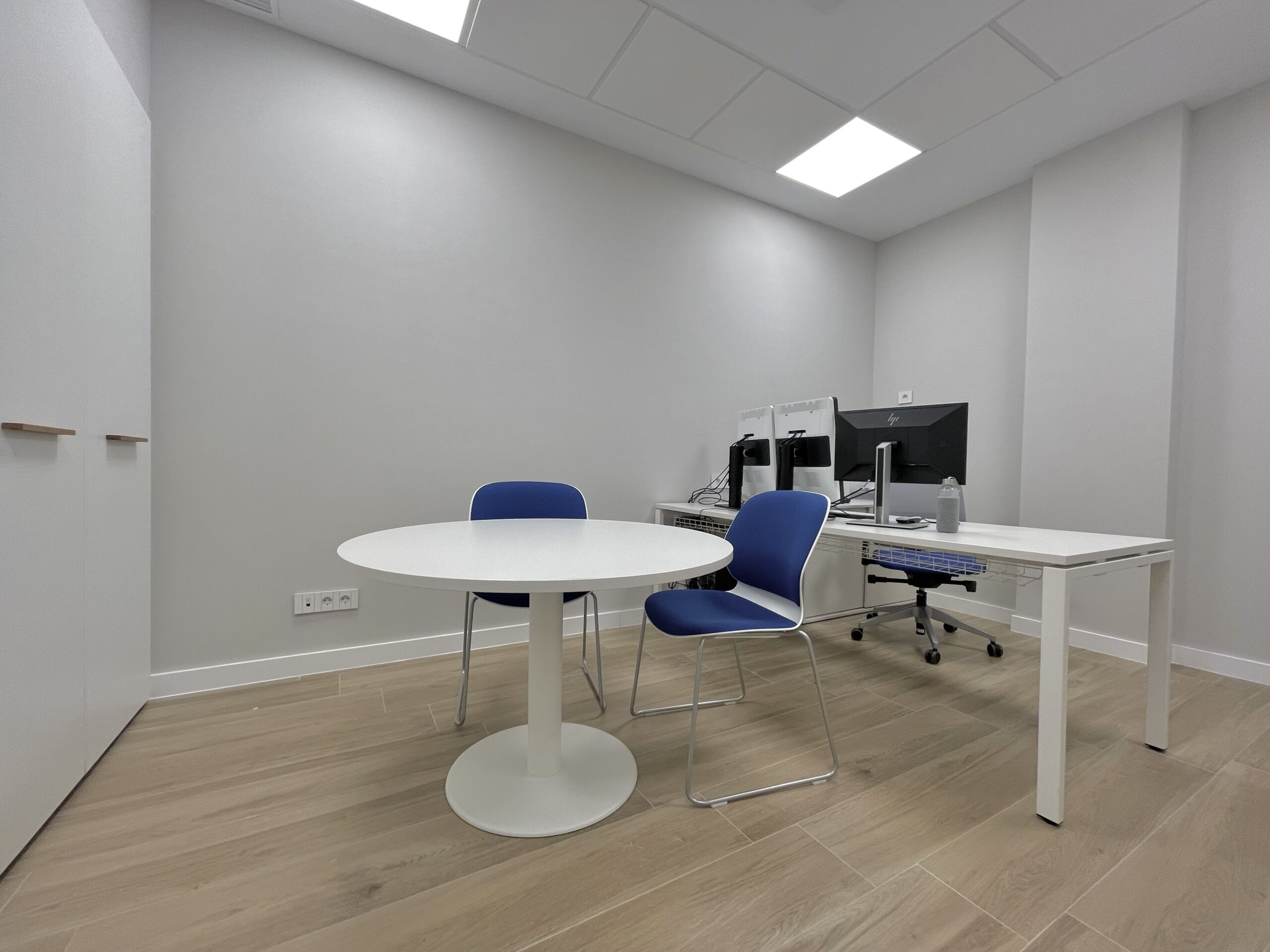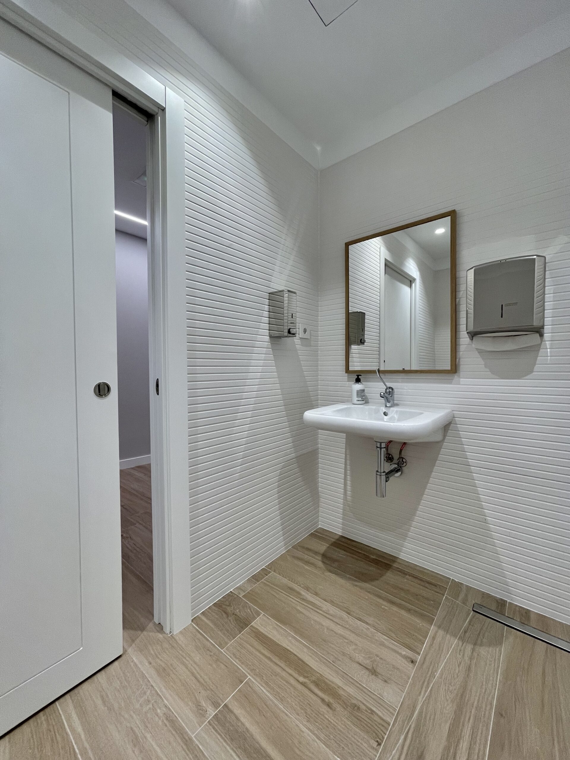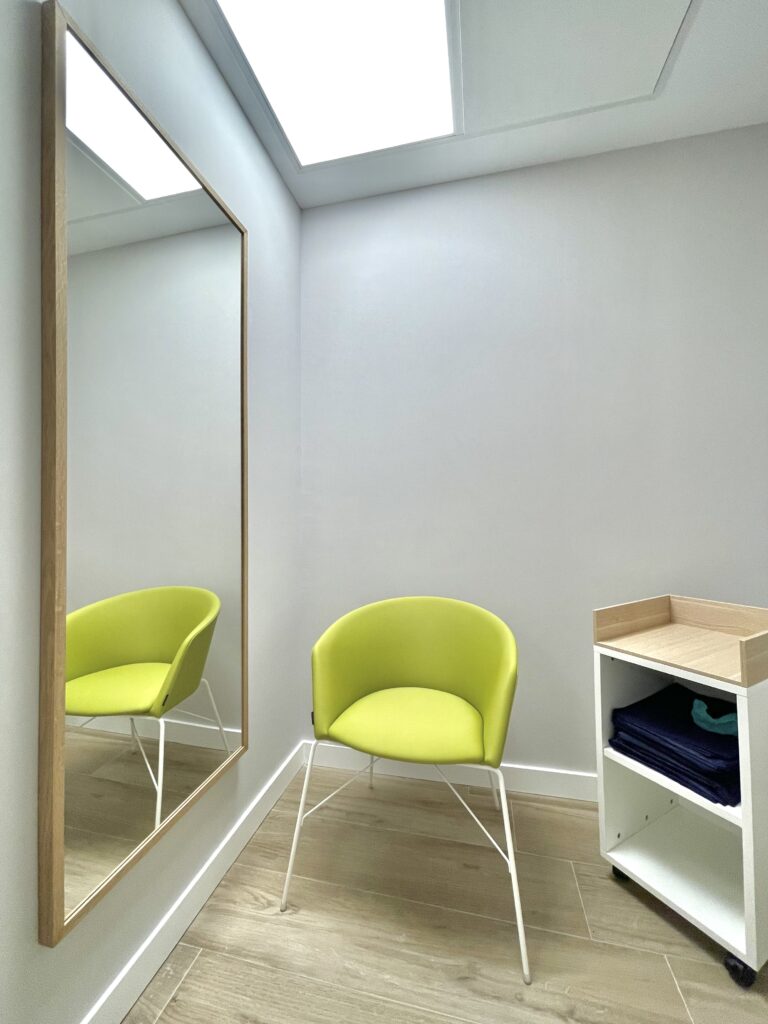 Para el diseño interior, desarrollamos mobiliario a medida en todas las áreas del centro: recepción, sala de espera, zona de control, office, vestuarios, baños, almacén y despacho. Cada pieza responde a criterios funcionales y de almacenamiento, facilitando el trabajo diario del personal sanitario y creando un entorno cómodo y eficiente.