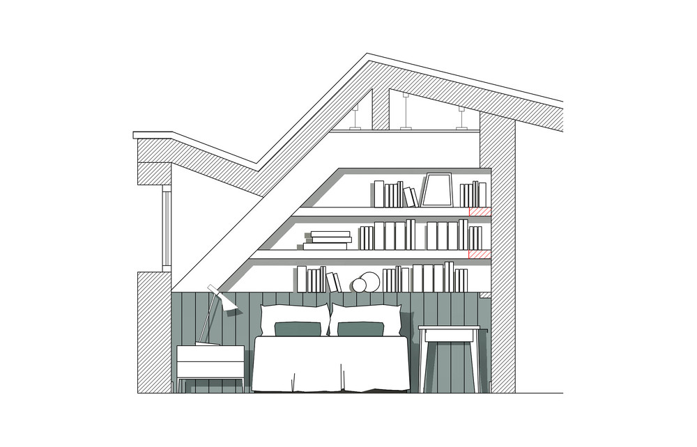 Para optimizar el espacio en la habitación, se implementó un diseño innovador, en el que el armario funciona como separador de ambiente, sin necesidad de añadir tabiques adicionales. Este enfoque maximiza la superficie disponible sin sacrificar la funcionalidad ni la estética del ático.