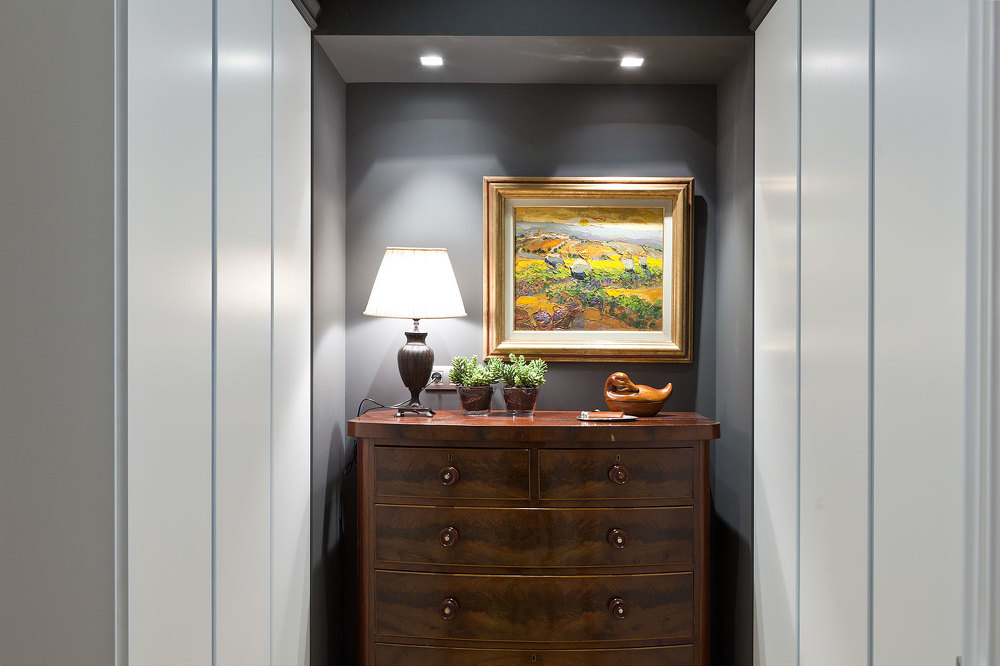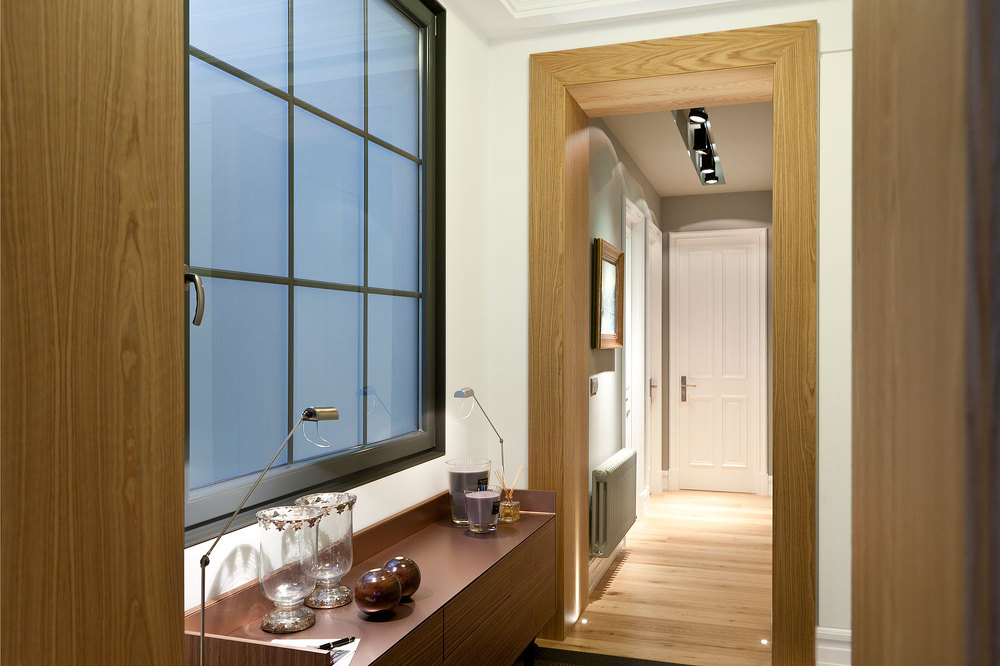 El nuevo proyecto de reforma dividió la vivienda en dos zonas claramente diferenciadas: la zona de día y la zona de noche. Esta separación se logró mediante el uso de dos arcos de roble en el hall, que marcan el acceso a cada área. Uno de los arcos da paso a las habitaciones, creando un espacio privado y tranquilo, que recibe luz natural desde un patio interior. El otro arco conecta con la zona de día, que incluye el salón, el estudio, el comedor y la cocina, creando una atmósfera amplia, fluida y luminosa.