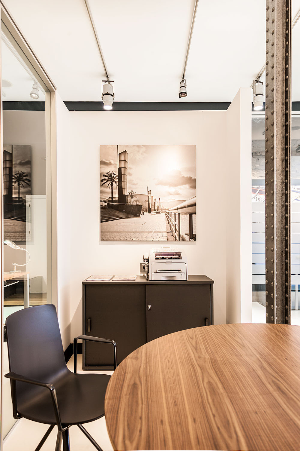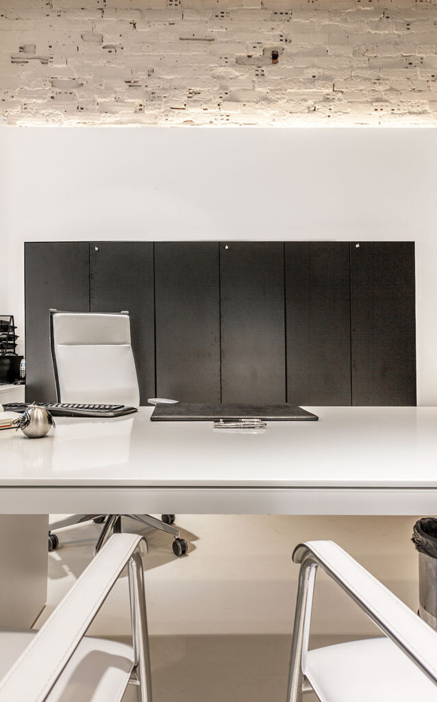 A la hora de elegir el mobiliario, optamos por piezas elegantes, resistentes y coherentes con la imagen del despacho. Utilizamos tonos neutros que aportan serenidad, mientras que los detalles en negro añaden personalidad y estilo. Además, incorporamos elementos decorativos como cuadros, los cuales enriquecen el espacio con un toque distintivo y sofisticado.