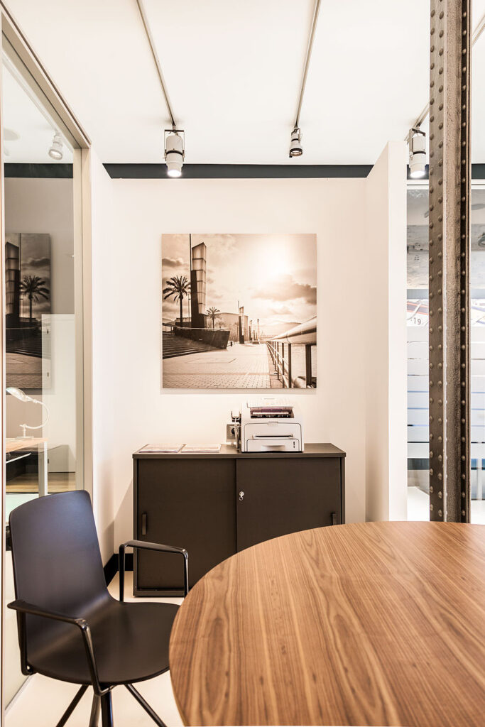 La iluminación jugó un papel esencial en esta reforma. Diseñamos un sistema lumínico que garantiza una visibilidad óptima en todas las zonas de trabajo, sin perder de vista la estética general. Esta estrategia no solo mejora la experiencia visual de quienes trabajan allí, sino que también refuerza la percepción positiva del cliente al visitar el despacho.