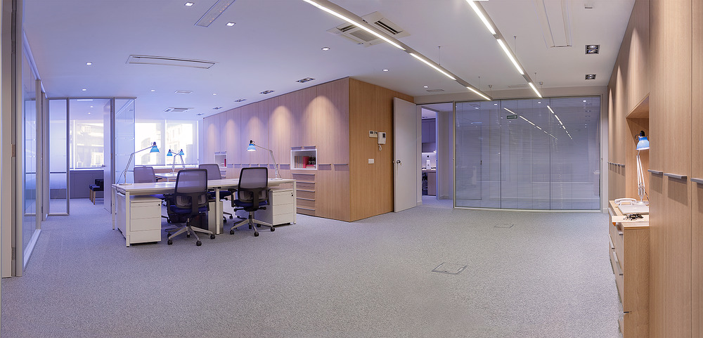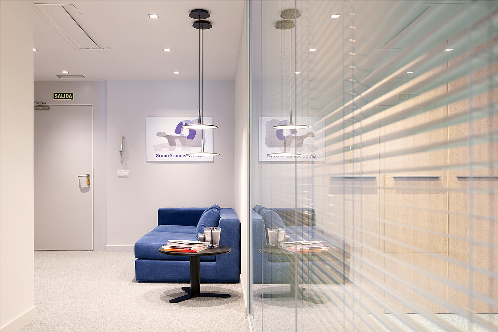 Un elemento innovador en este diseño son las cortinas verticales correderas, que ofrecen flexibilidad para ajustar la privacidad de las áreas de trabajo. Con un simple movimiento, se pueden crear espacios privados para reuniones confidenciales o despachos, sin perder la sensación de amplitud ni la luminosidad natural. Además, se ha incorporado opacidad en algunas áreas de la cristalera para garantizar mayor privacidad sin comprometer el flujo de luz.