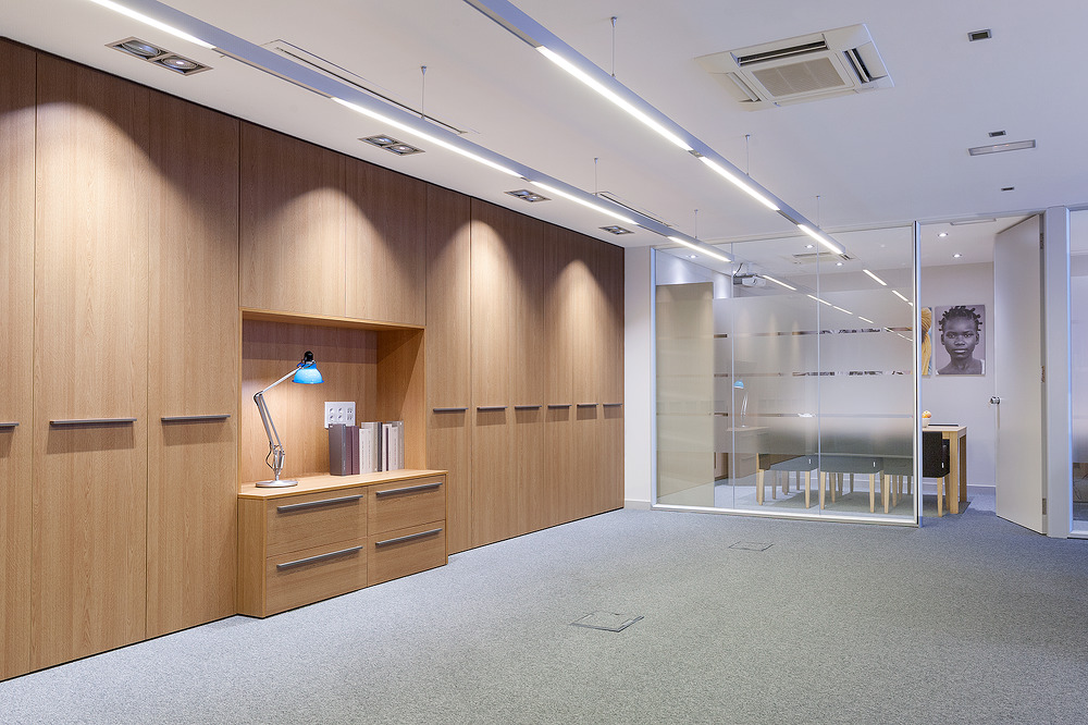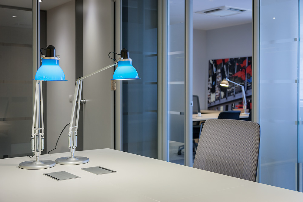 Una de las principales características de este diseño son las amplias cristaleras en oficinas, que separan de manera sutil las distintas áreas de trabajo. Estas divisiones no solo permiten mantener una visión abierta y conectada del espacio, sino que también maximizan la entrada de luz natural. Esto contribuye al bienestar de los empleados y a la eficiencia energética, reduciendo la necesidad de iluminación artificial durante el día.