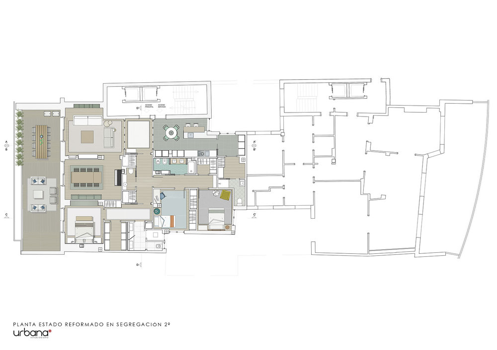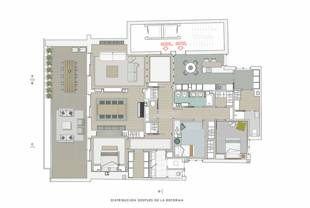 • Rediseño de la distribución para crear viviendas independientes y funcionales.